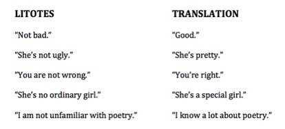 UNDERSTATEMENT or LITOTES: It phrases something in an unexpectedly restrained way. Paradoxically, to deemphasize through understatement can be a way of emphasizing, of making people react with ¨there must be more to it than that